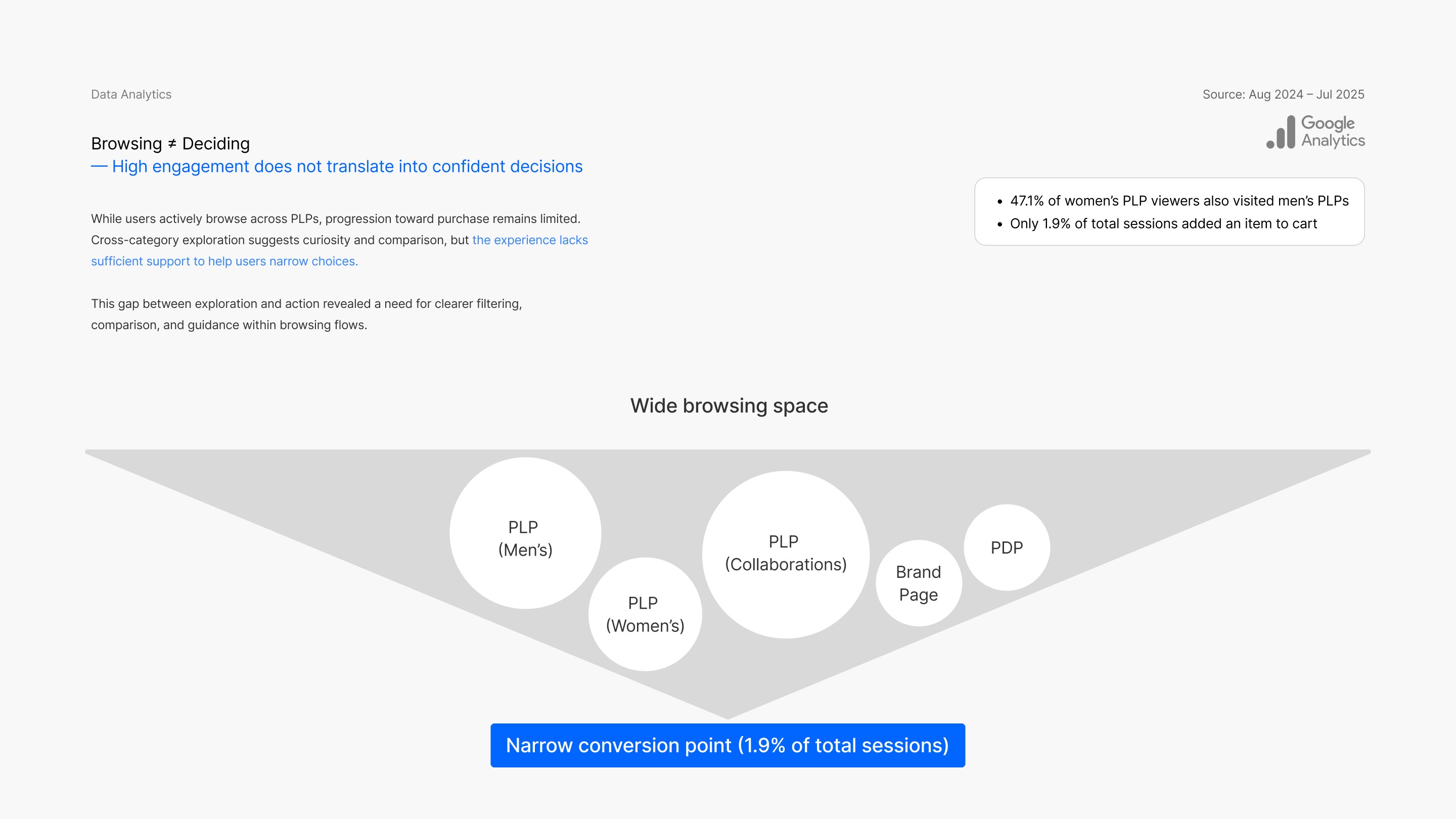 While users actively browse across PLPs, progression toward purchase remains limited. Cross-category exploration suggests curiosity and comparison, but the experience lacks sufficient support to help users narrow choices.