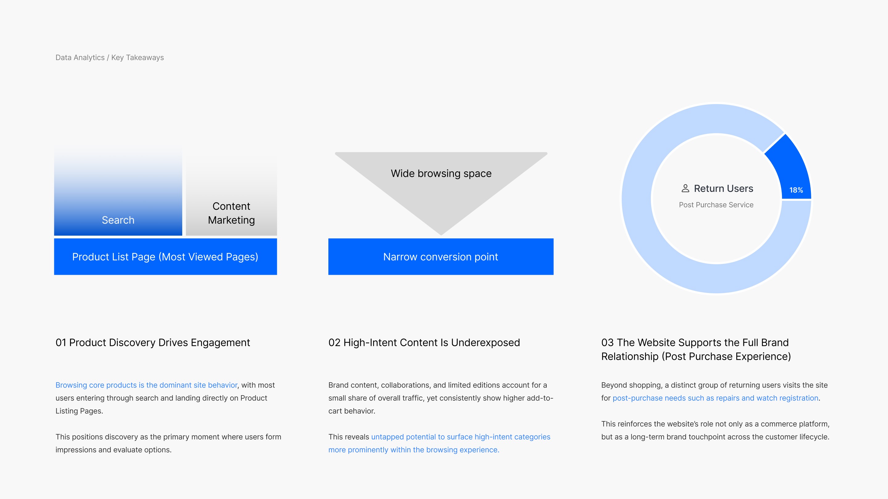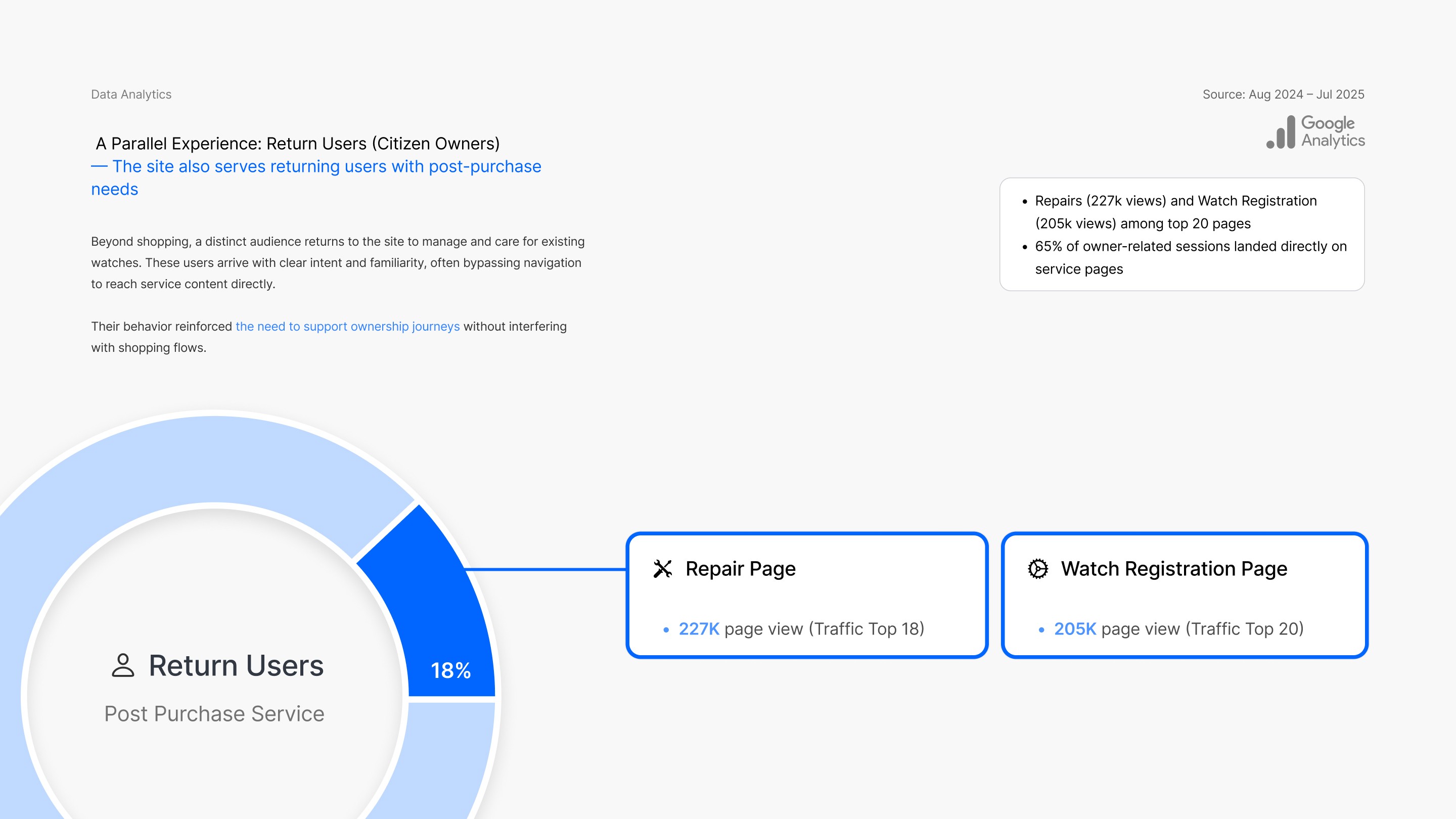 Beyond shopping, a distinct group of returning users visits the site for post-purchase needs such as repairs and watch registration.