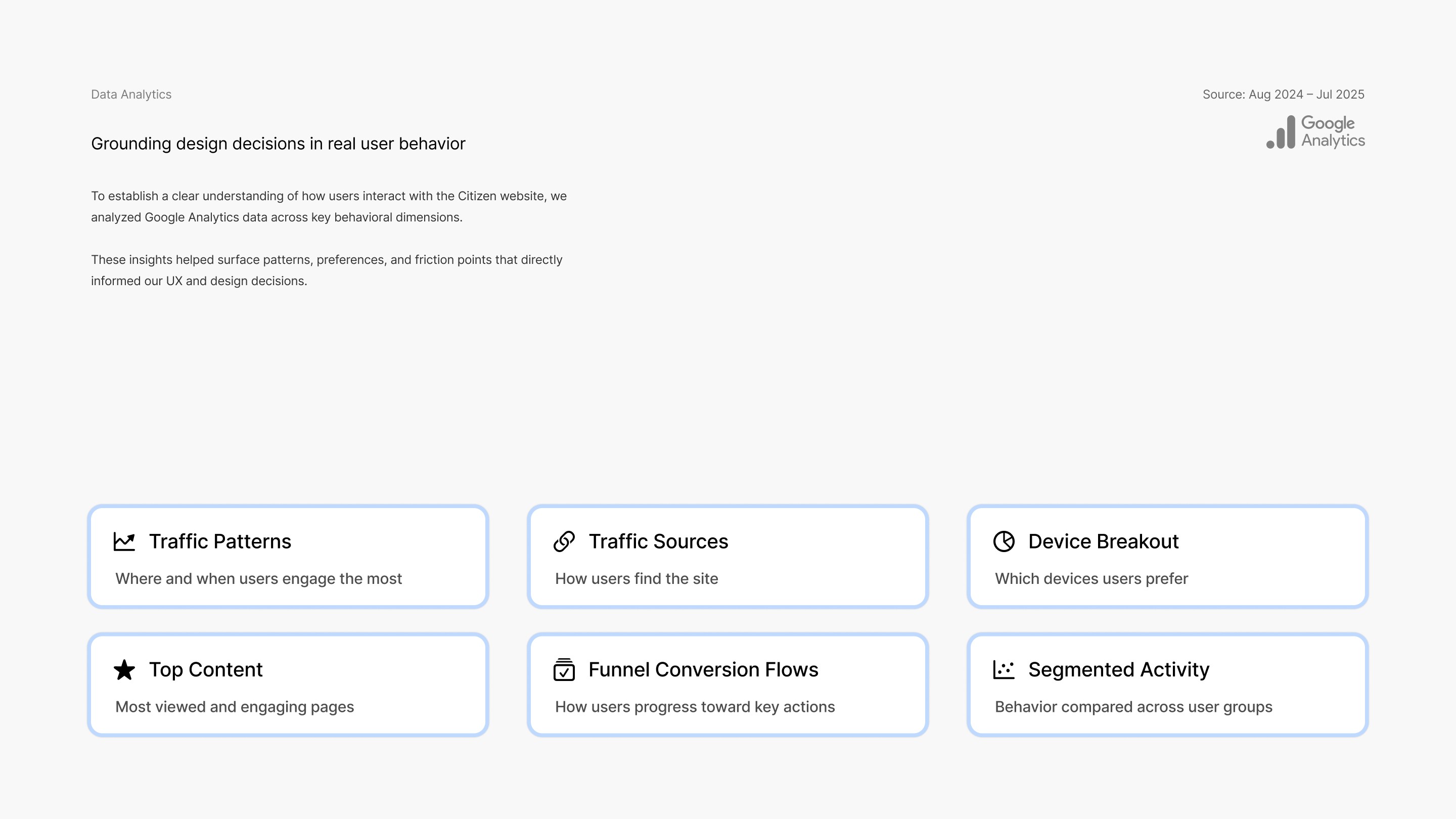 To establish a clear understanding of how users interact with the Citizen website, we analyzed Google Analytics data across key behavioral dimensions.
