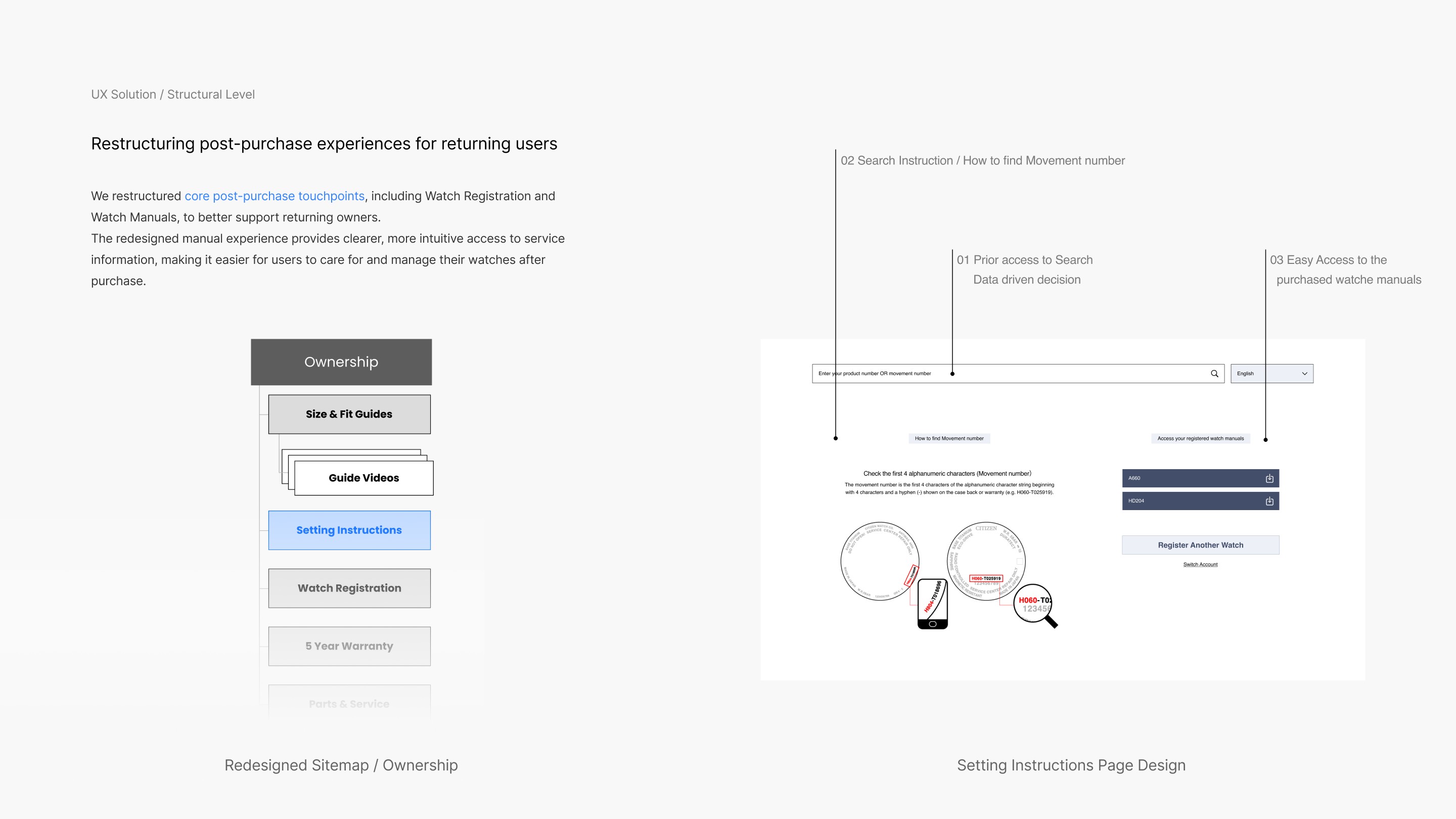 We restructured core post-purchase touchpoints, including Watch Registration and Watch Manuals, to better support returning owners. The redesigned manual experience provides clearer, more intuitive access to service information, making it easier for users to care for and manage their watches after purchase.