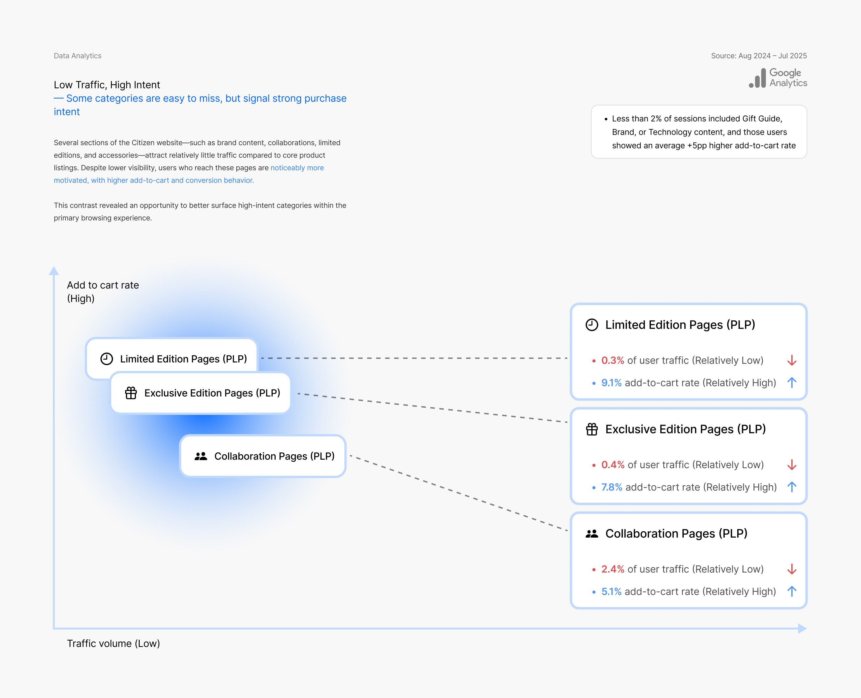 Several sections of the Citizen website—such as brand content, collaborations, limited editions, and accessories—attract relatively little traffic compared to core product listings. Despite lower visibility, users who reach these pages are noticeably more motivated, with higher add-to-cart and conversion behavior.