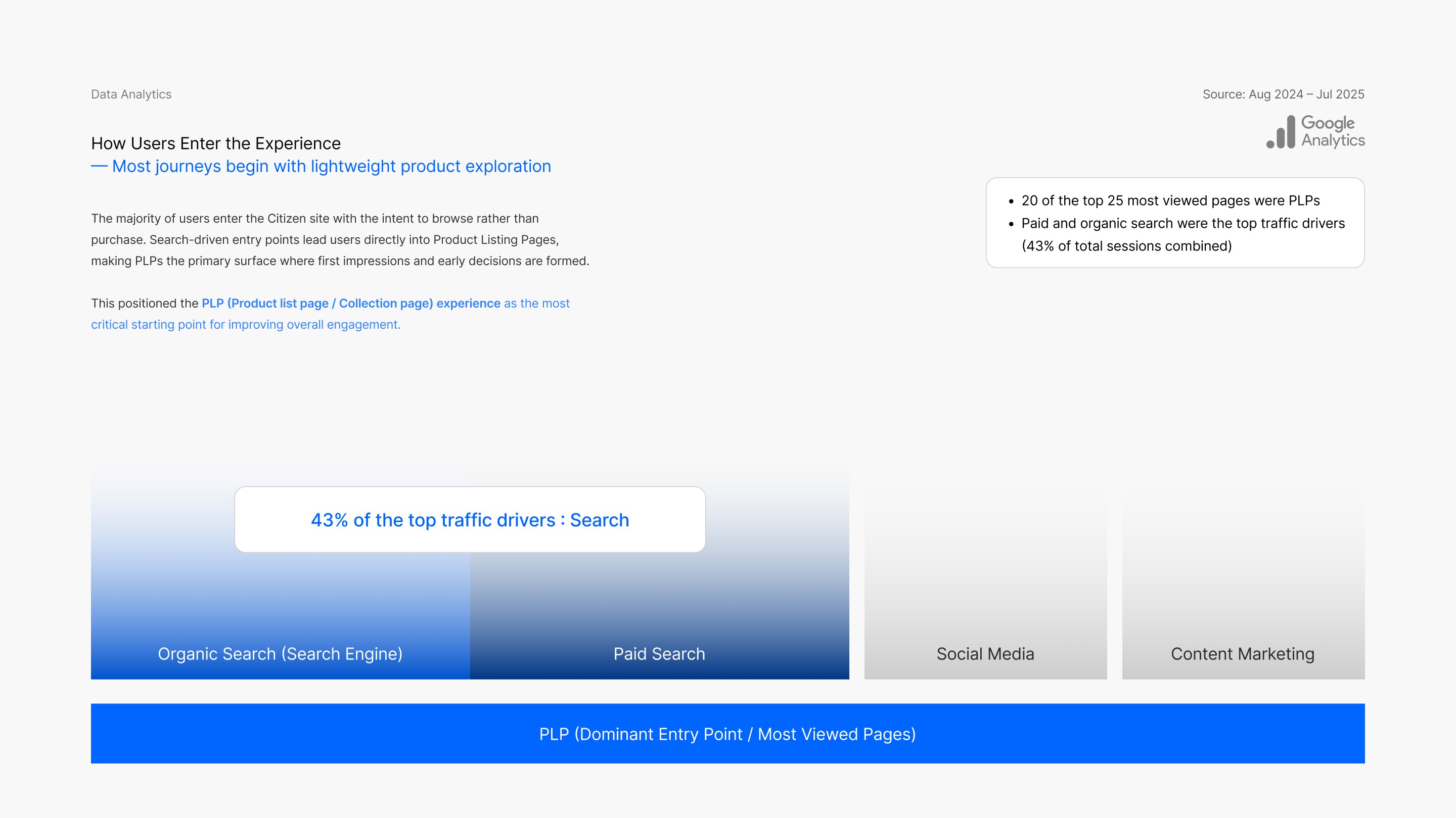 The majority of users enter the Citizen site with the intent to browse rather than purchase. Search-driven entry points lead users directly into Product Listing Pages, making PLPs the primary surface where first impressions and early decisions are formed.