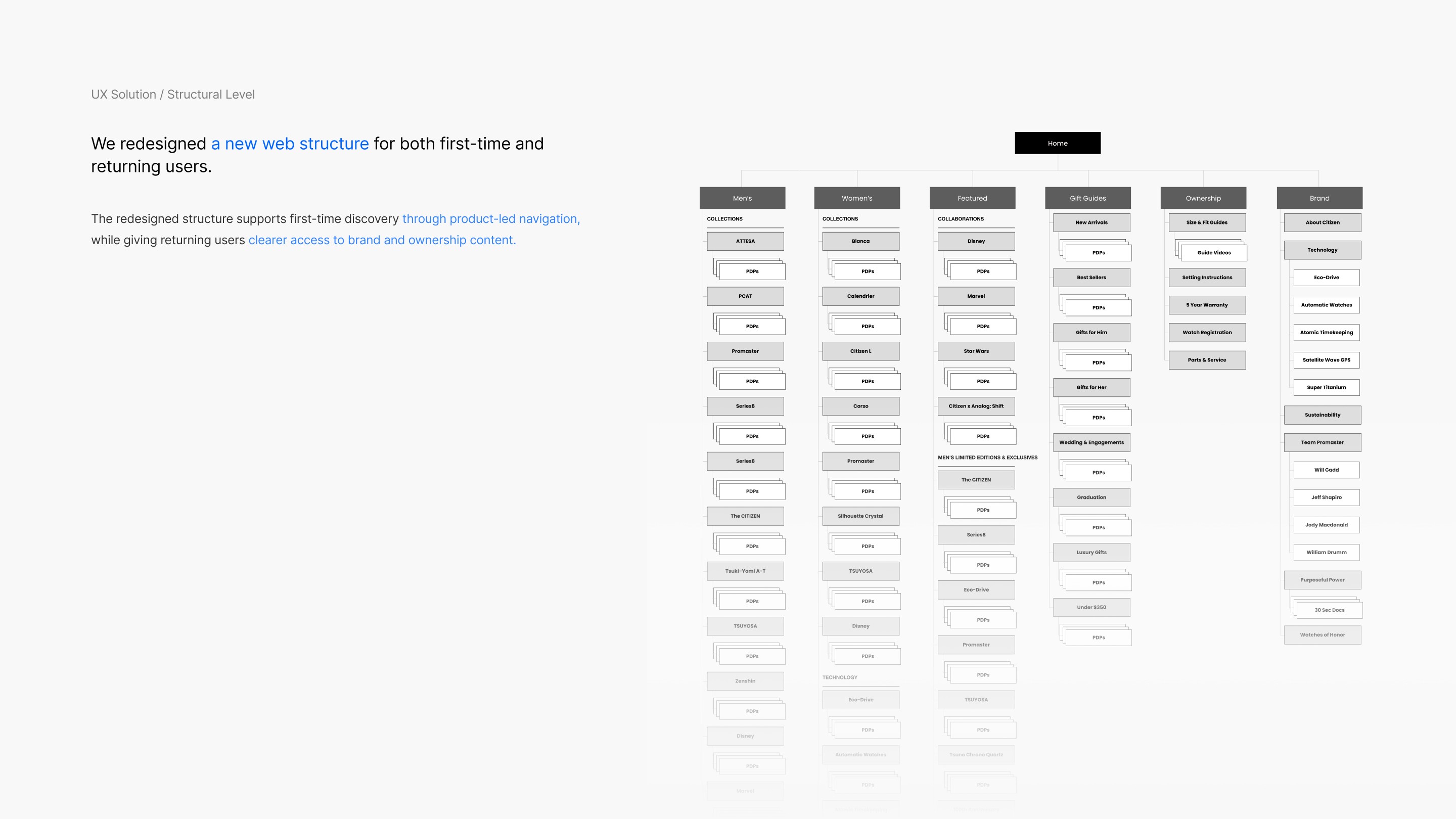 As a UX Designer at The Barbarian Group, I collaborated on the end-to-end redesign of Citizen Watch’s global digital platform. Our team utilized data analysis to identify limitations in the legacy site, which we addressed at both the structural and executional levels.