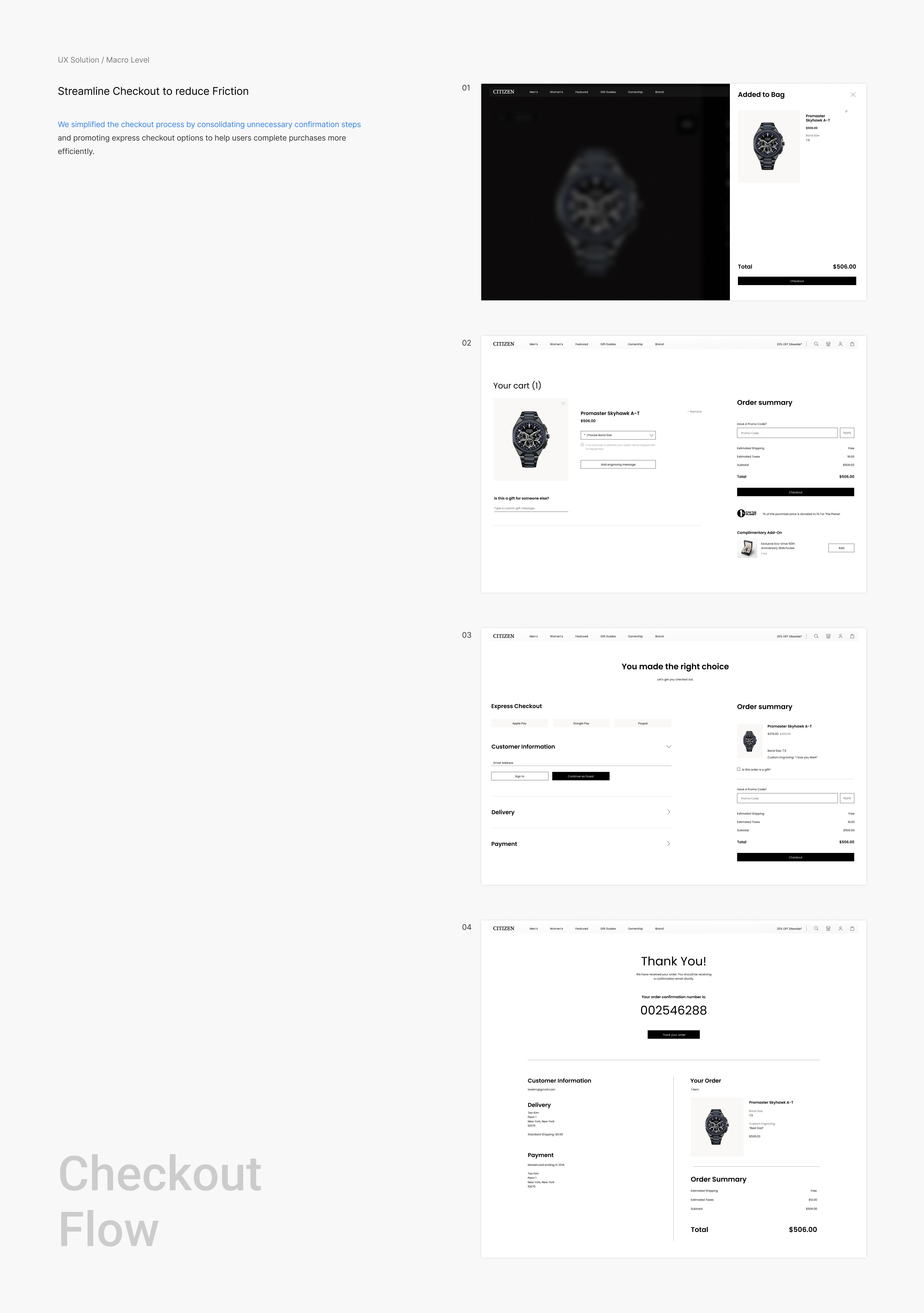 We simplified the checkout process by consolidating unnecessary confirmation steps and promoting express checkout options to help users complete purchases more efficiently.