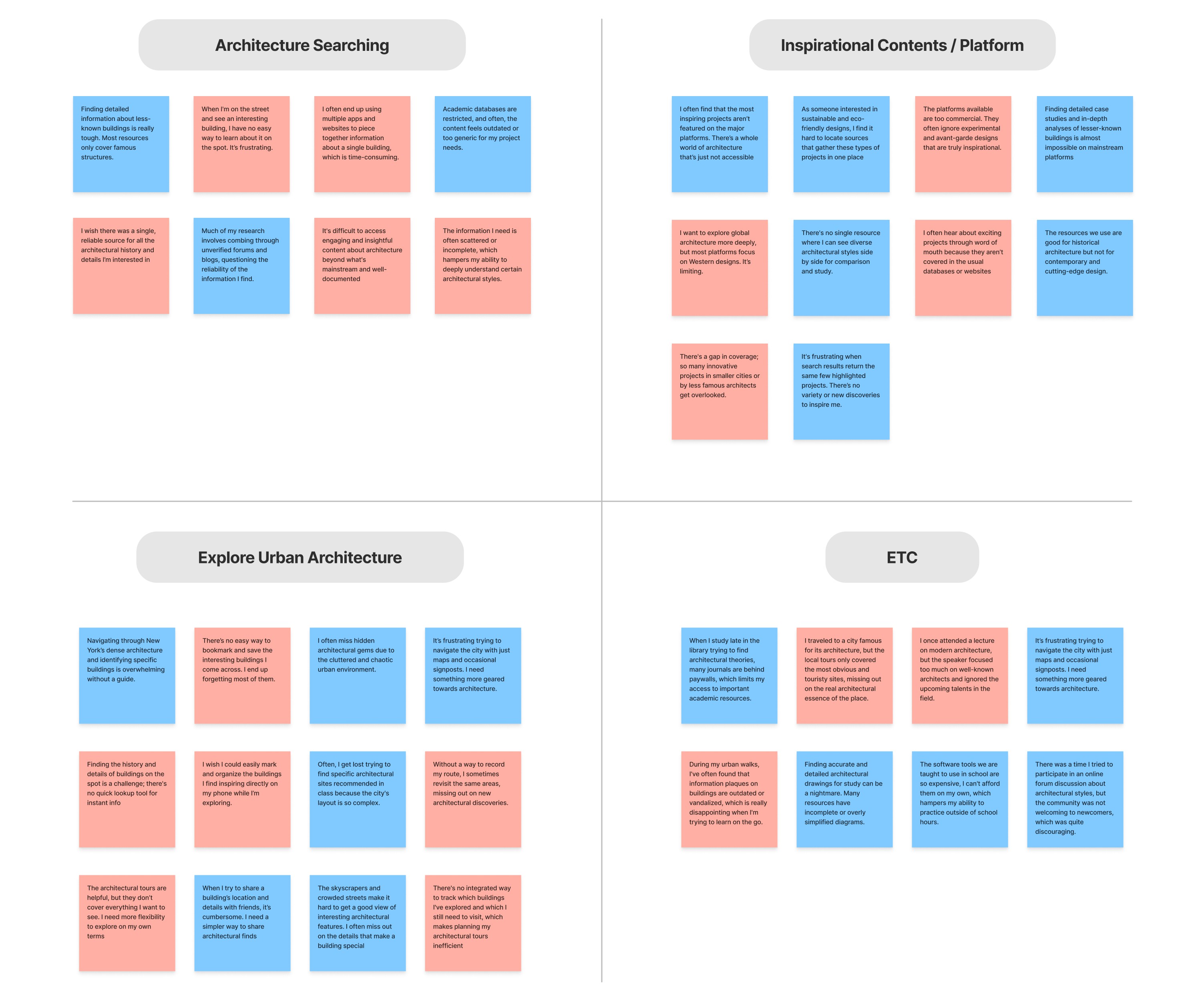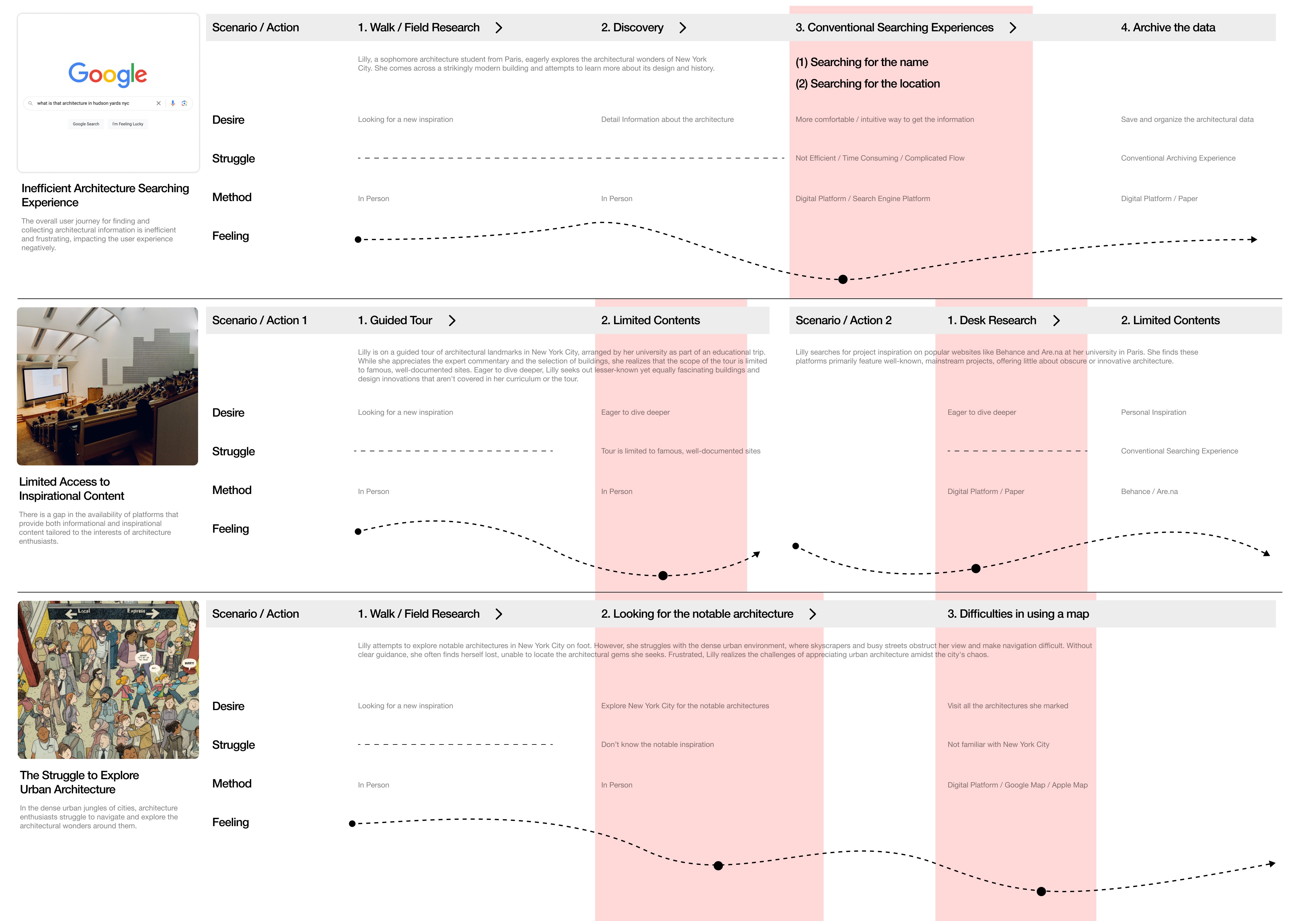 The research has discovered a significant gap in the resources available to architecture students and fans. Despite the wealth of architectural information and inspiration that exists, there is no centralized platform that caters specifically to their needs. As a result, they struggle to find comprehensive and reliable information about buildings, leading to a fragmented and frustrating user journey.