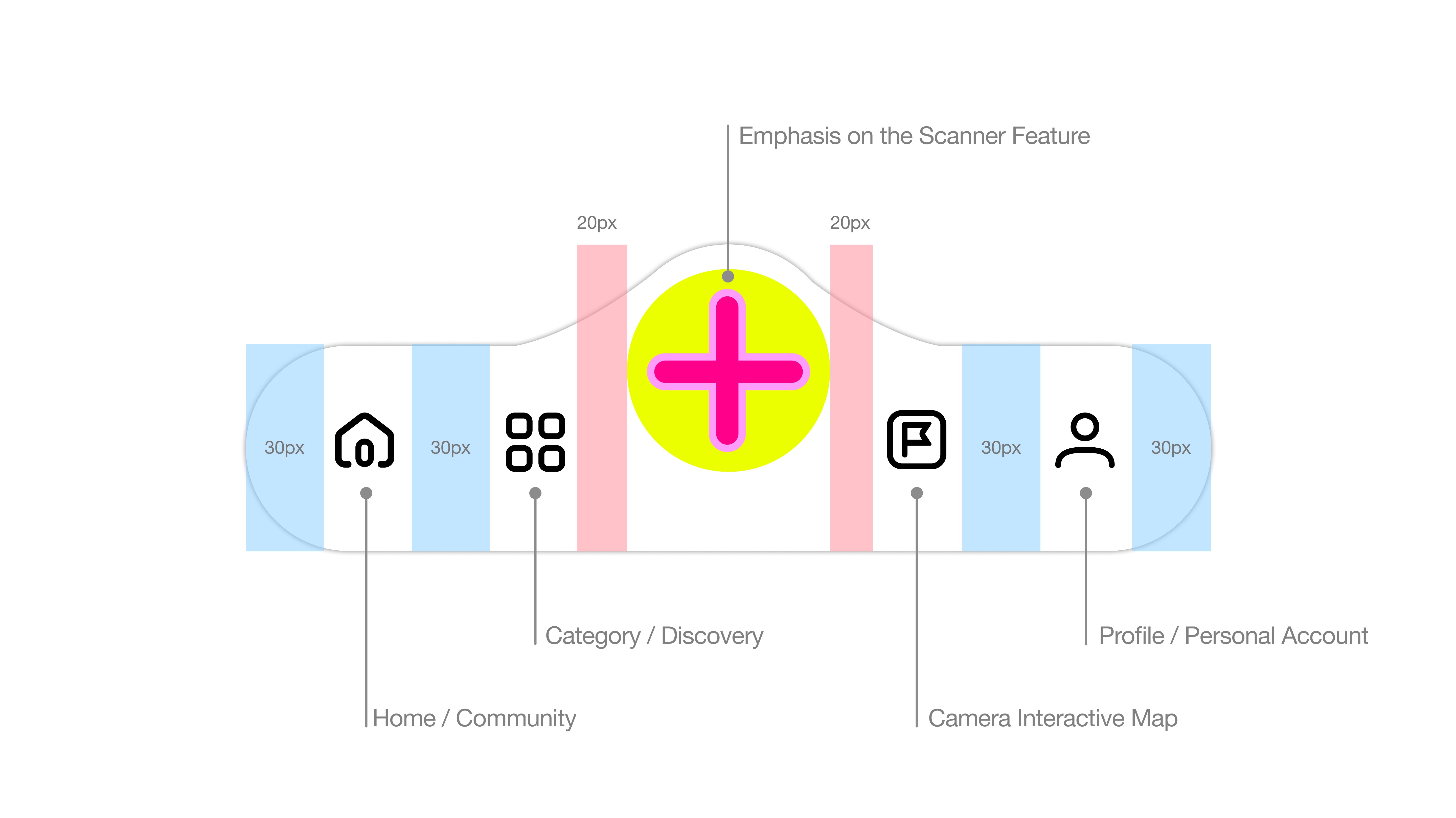 I've highlighted the central button for the architecture scanner, challenging traditional design and focusing on the app's unique function. This 'Innovative Navigation Design' provides users with a direct and engaging way to explore architecture.