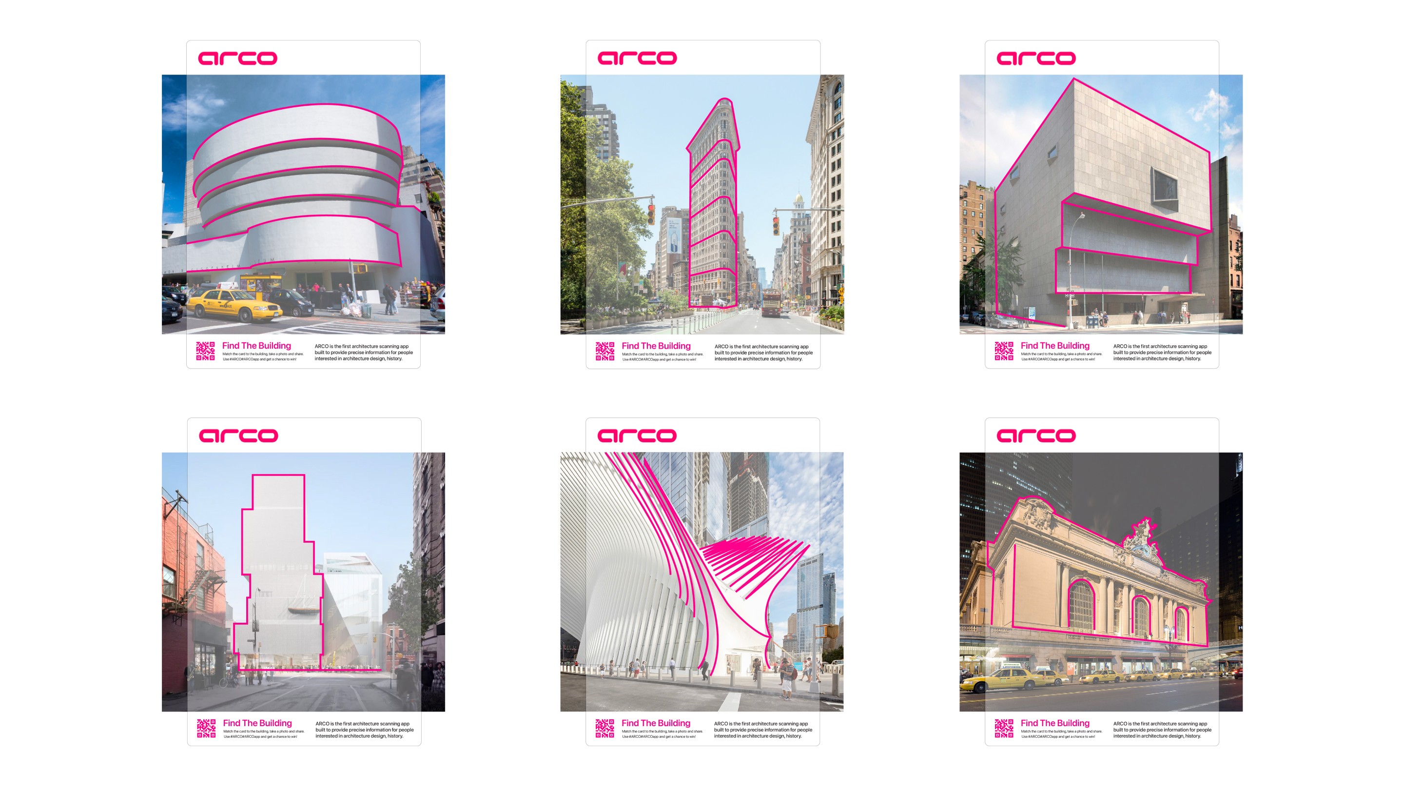 ARCO held an event around New York City for the launch of their first architecture inspirational app. For the event, ARCO created 6 different transparent cards with ARCO’s scan graphic printed on it.