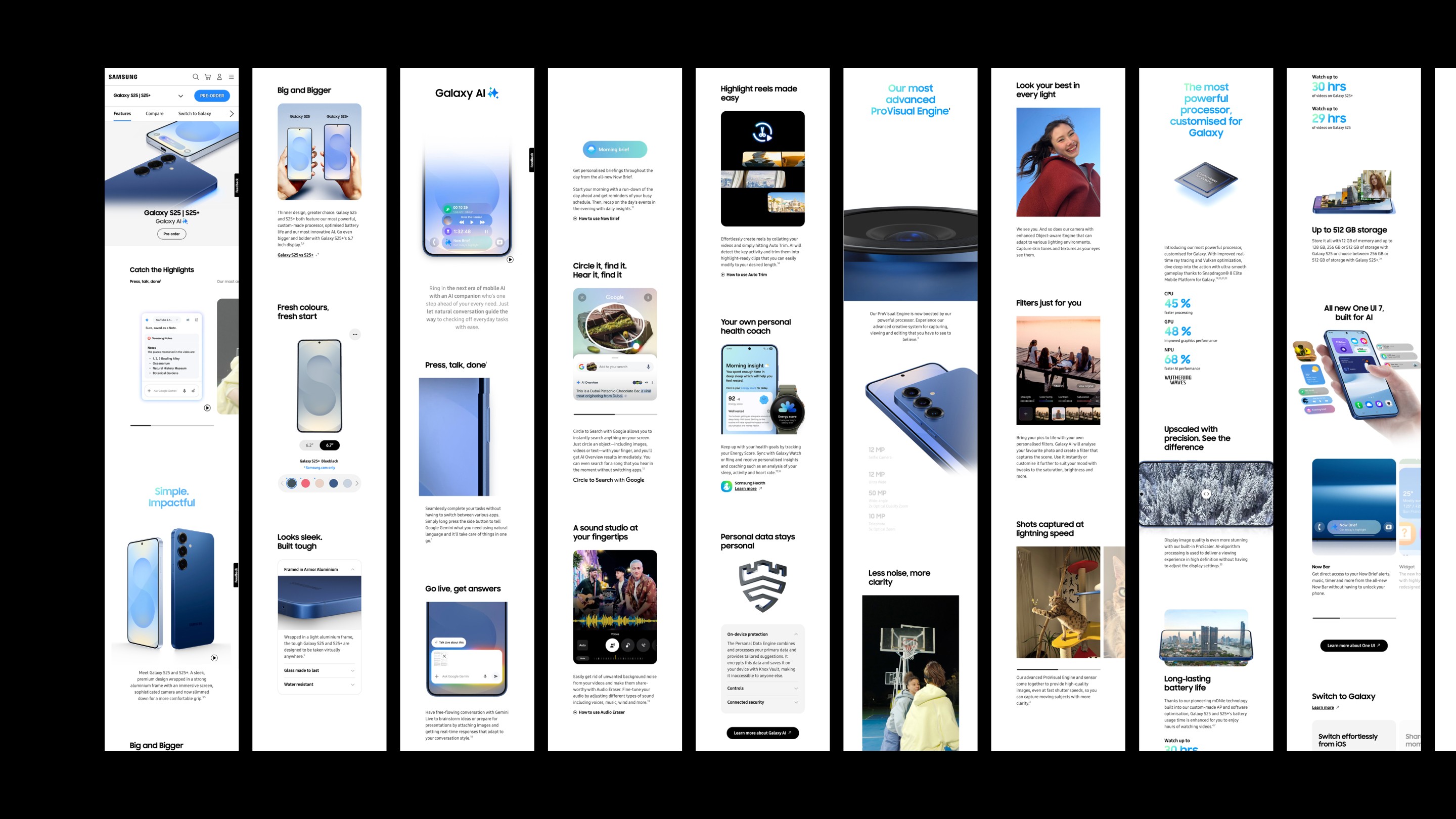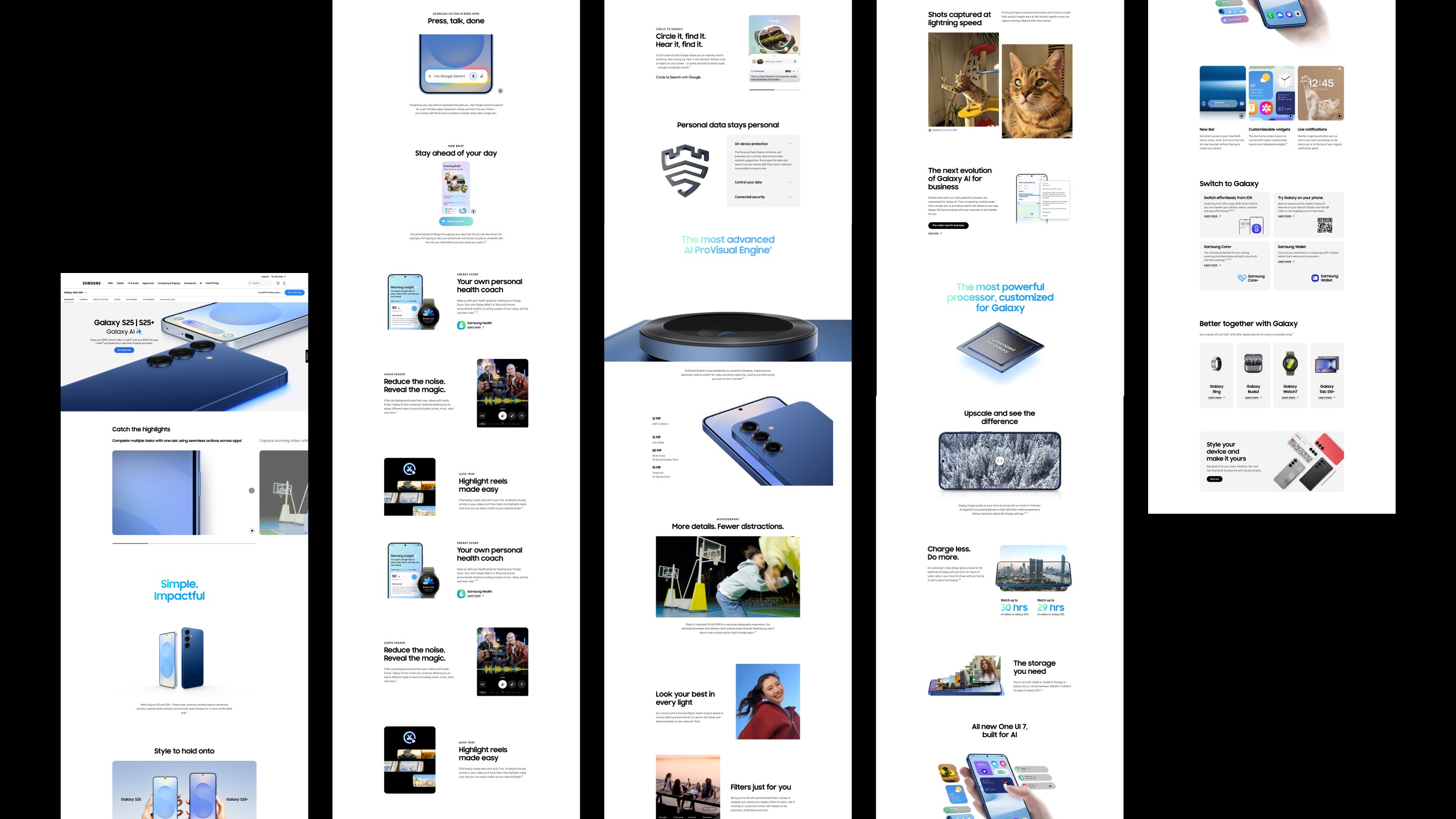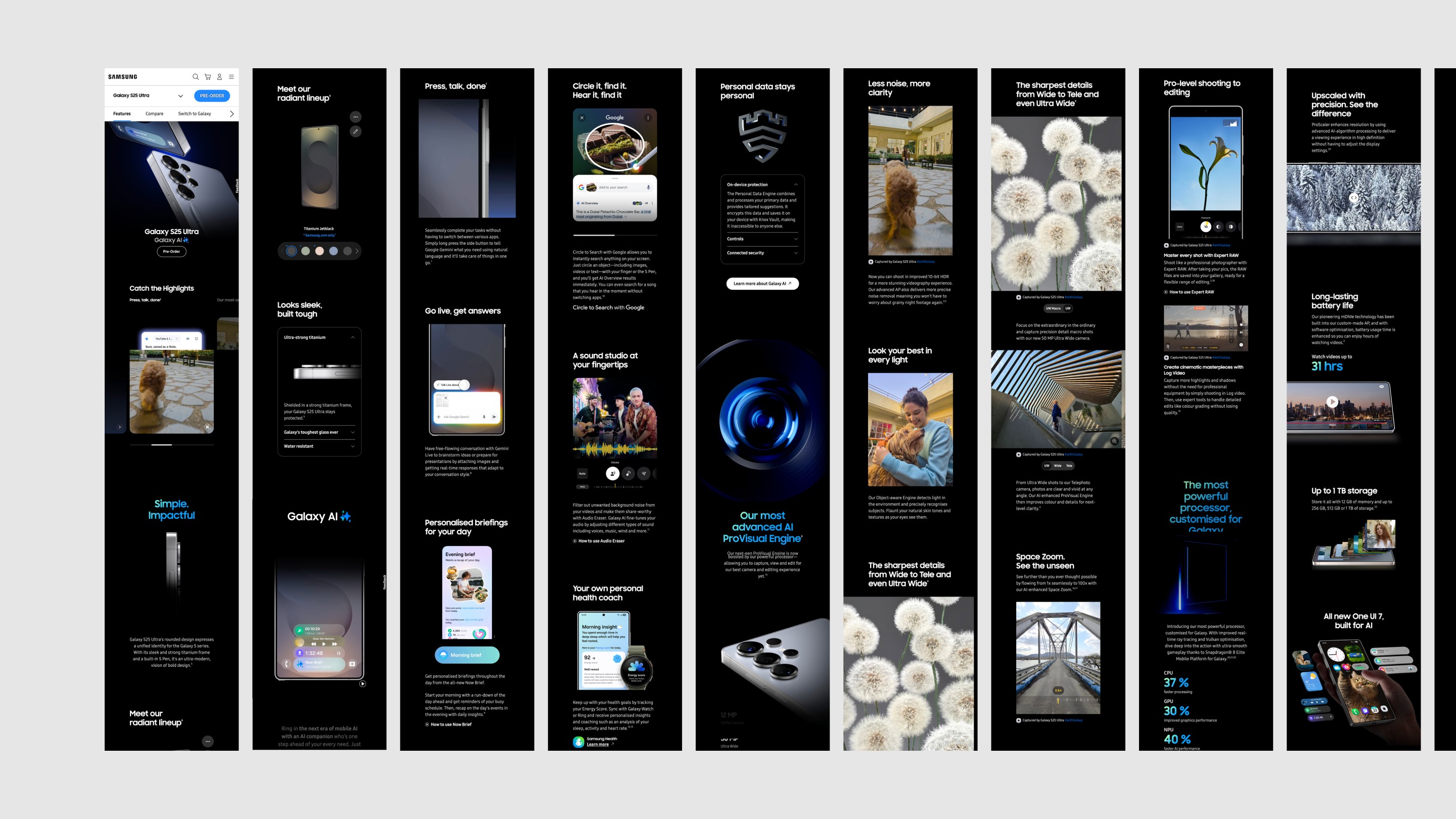 For the Samsung Galaxy S25 and S25 Ultra, we designed a product detail page that not only informs but captivates. Our goal was to create a dynamic experience tailored to Samsung’s target users by translating technical feature lists into visually engaging elements like 3D animations and use case videos. Each feature was strategically categorized based on user personas’ lifestyles and interests, ensuring a personalized and intuitive exploration of the device’s capabilities. The design was meticulously crafted for both web and mobile formats, optimizing the experience across all screen sizes.