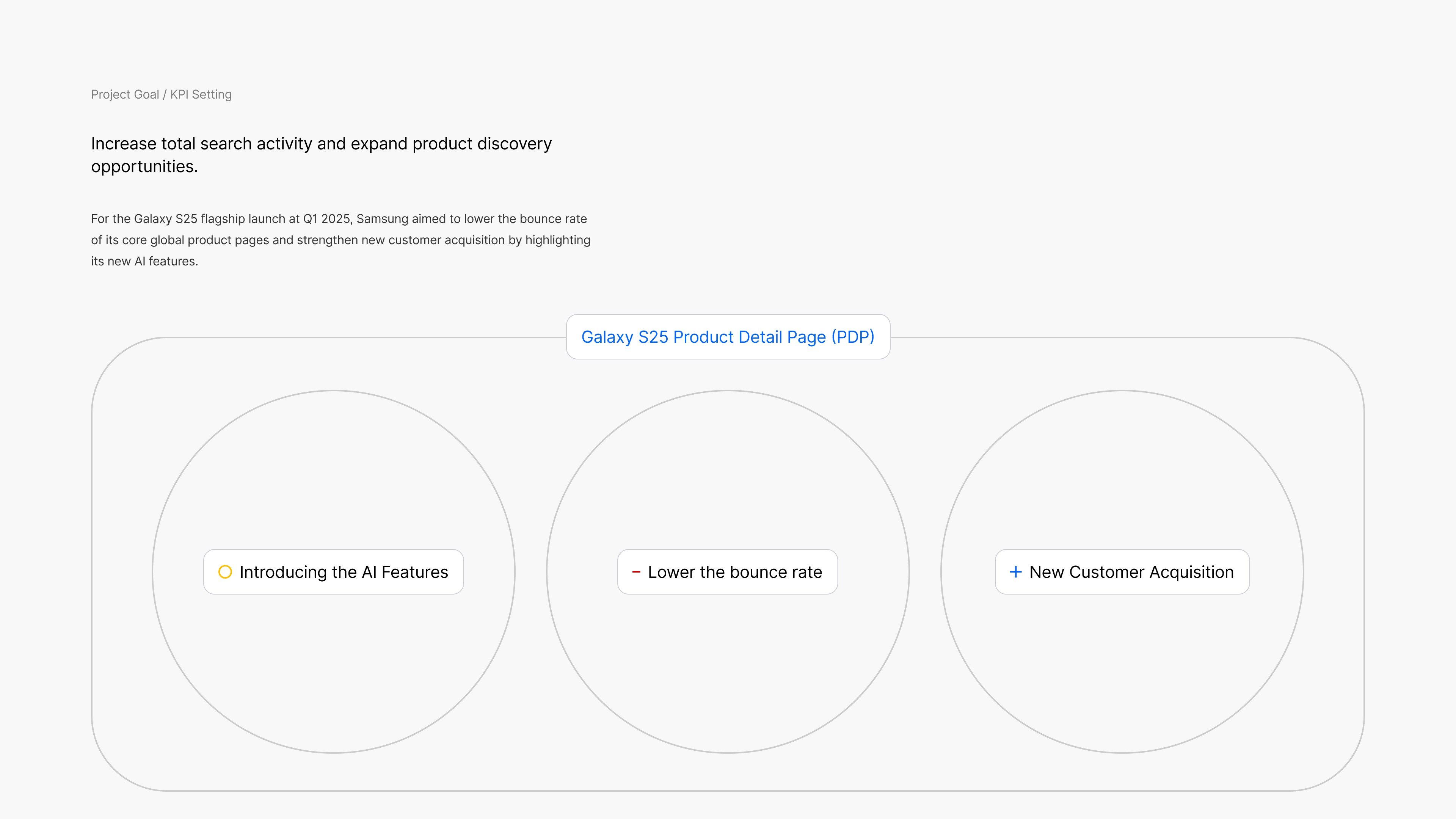 For the Galaxy S25 flagship launch at Q1 2025, Samsung aimed to lower the bounce rate of its core global product pages and strengthen new customer acquisition by highlighting its new AI features.