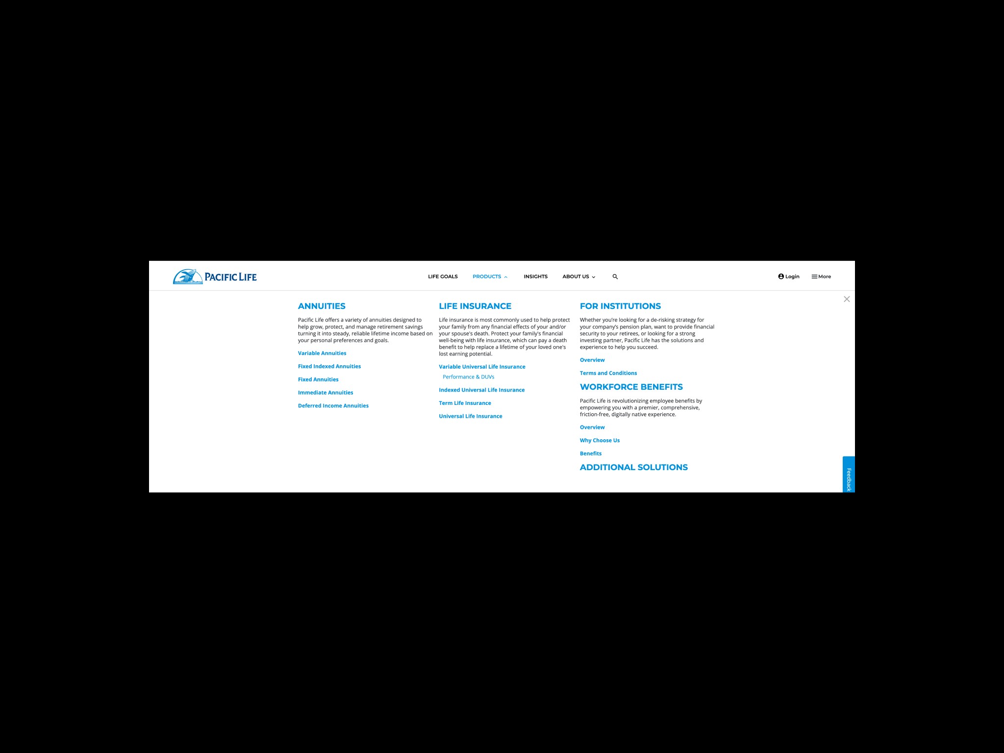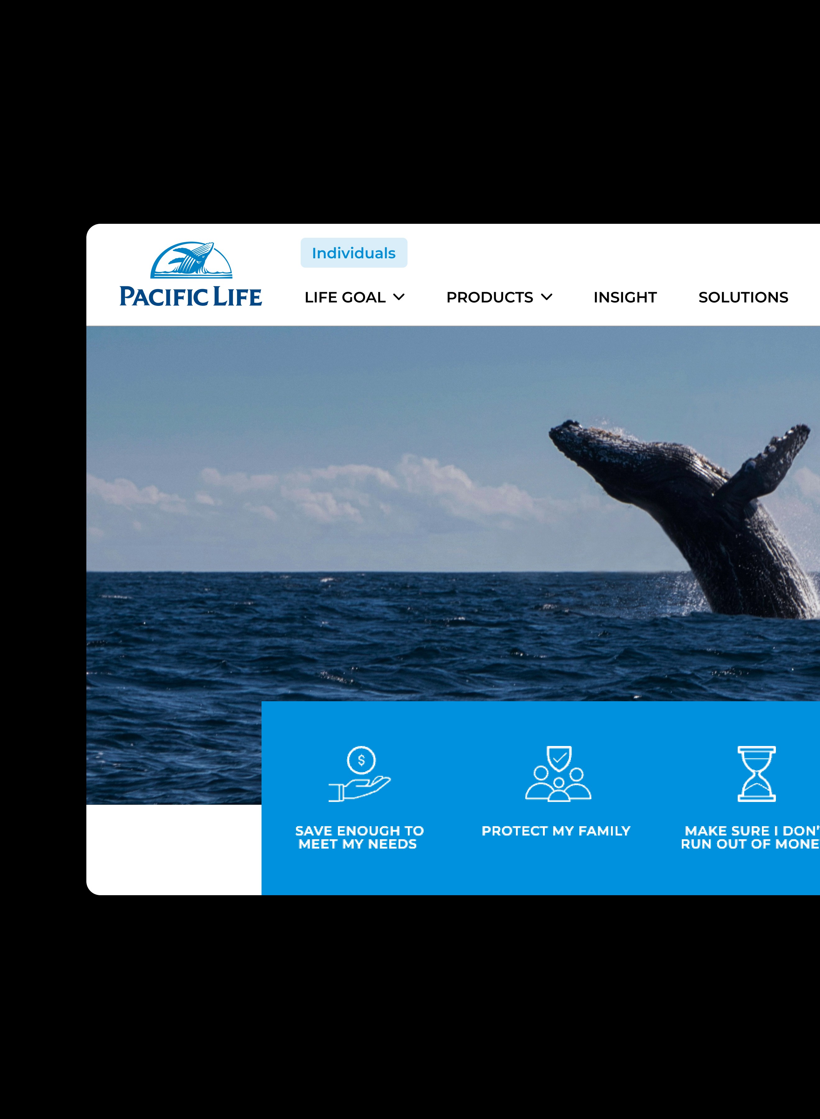 The key challenge in redesigning Pacific Life’s web navigation was addressing the unique composition of its target audience within the insurance industry. Visitors to Pacific Life’s website fall into four distinct groups—Individuals, Financial Professionals, Institutions, and Employers—each requiring access to different sets of information and services. To resolve this, we developed a multi-tiered navigation structure that intuitively guides users to the content they need.