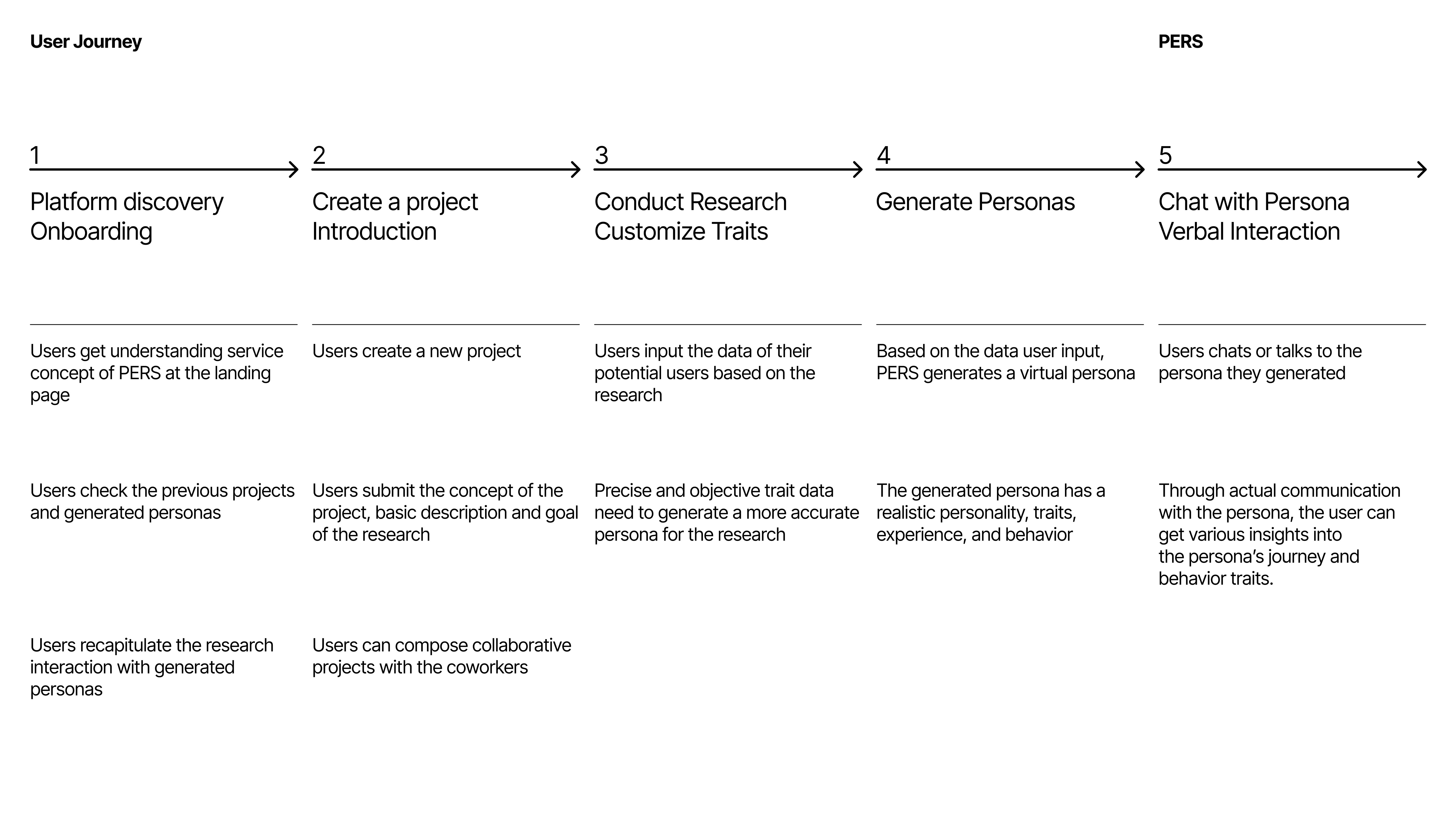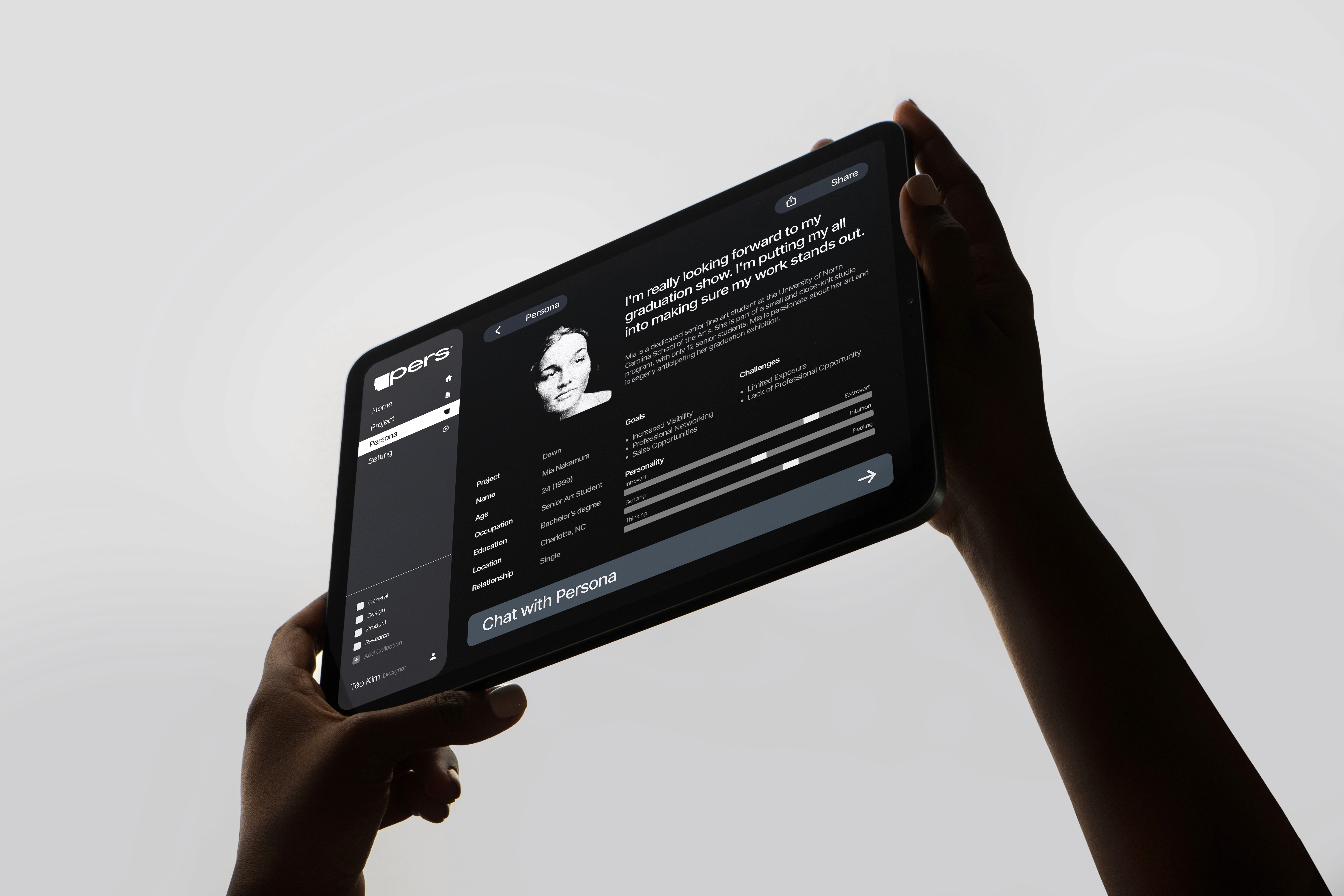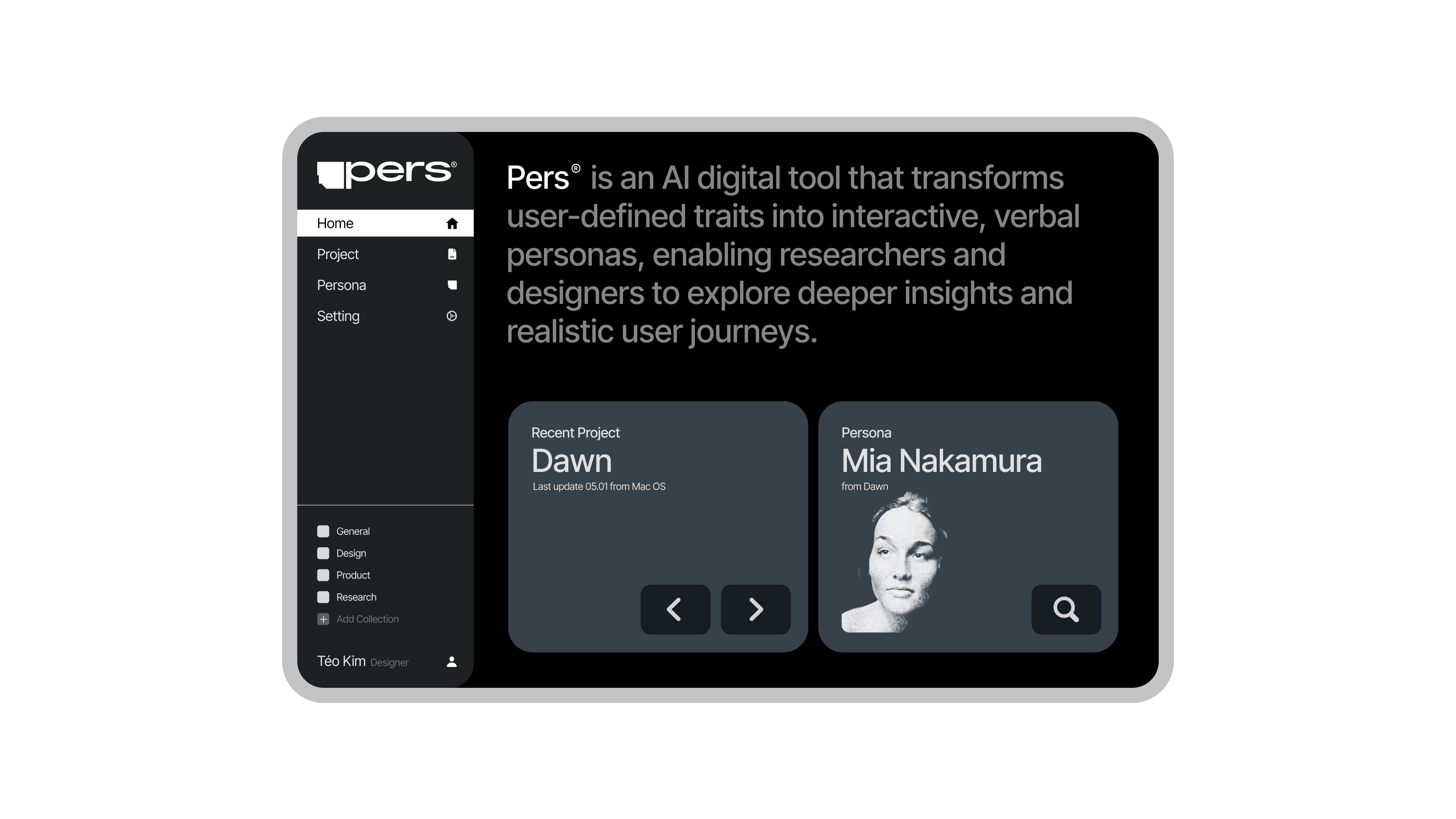Pers is a digital tool that generates a virtual persona capable of verbal interaction based on nodes (traits) set by the user. It goes beyond simply AI-generating personas. With PERS, you can directly derive and discuss the Persona's User Journey, Pain Points, Feelings, and Insights through conversation. This allows for flexible integration of these insights into your projects.