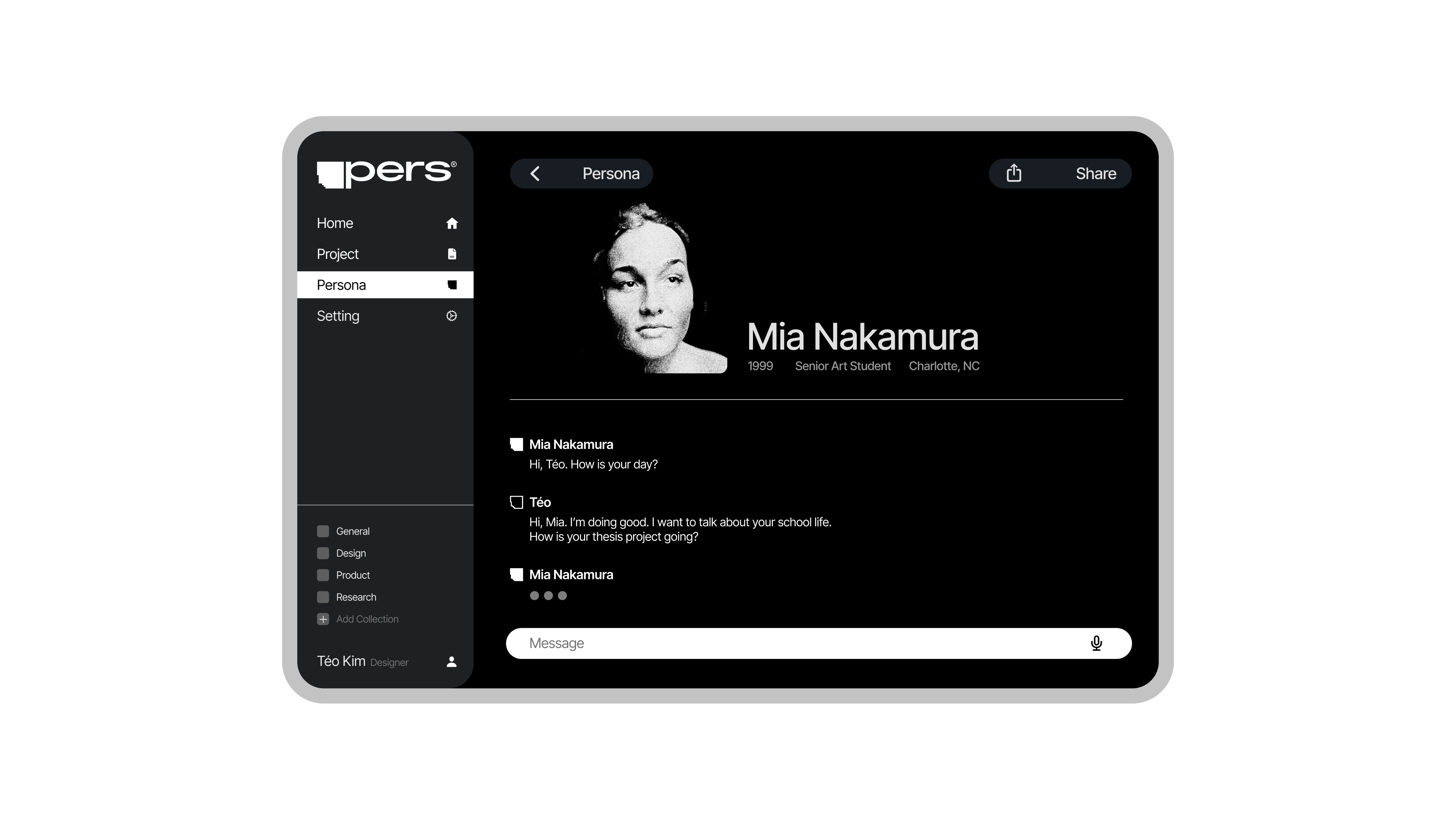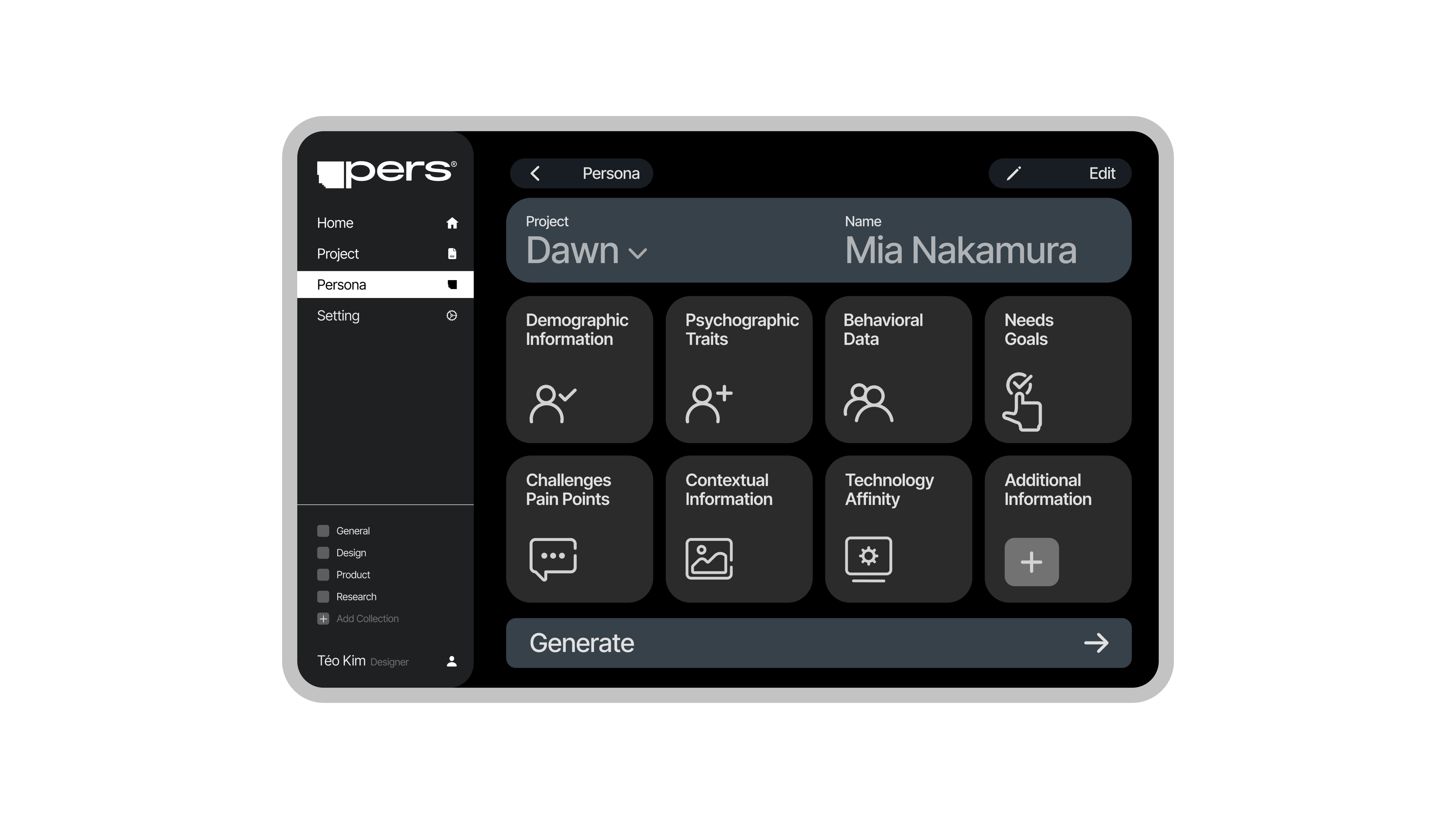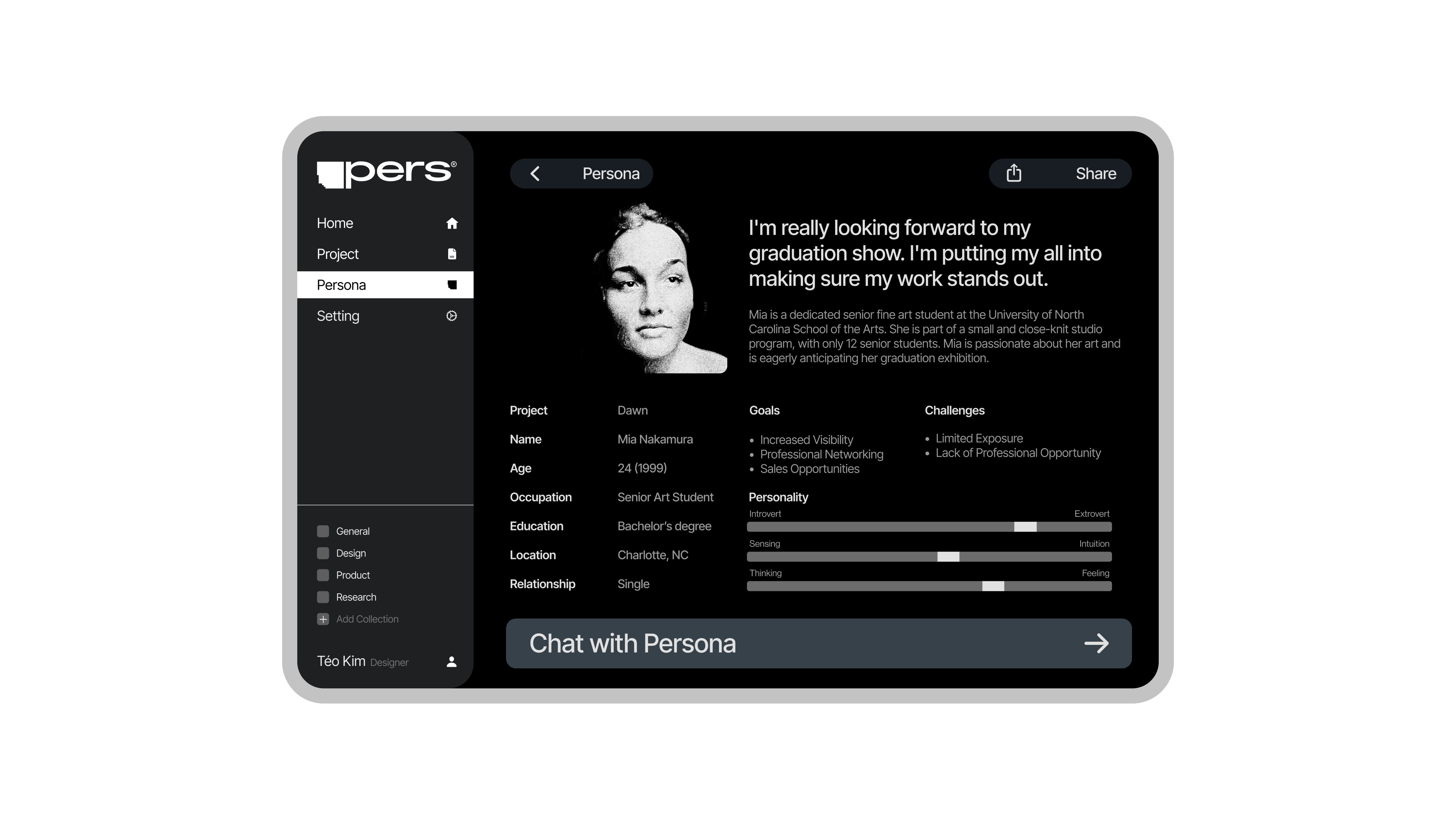 Pers is a digital tool that generates a virtual persona capable of verbal interaction based on nodes (traits) set by the user. It goes beyond simply AI-generating personas. With PERS, you can directly derive and discuss the Persona's User Journey, Pain Points, Feelings, and Insights through conversation. This allows for flexible integration of these insights into your projects.