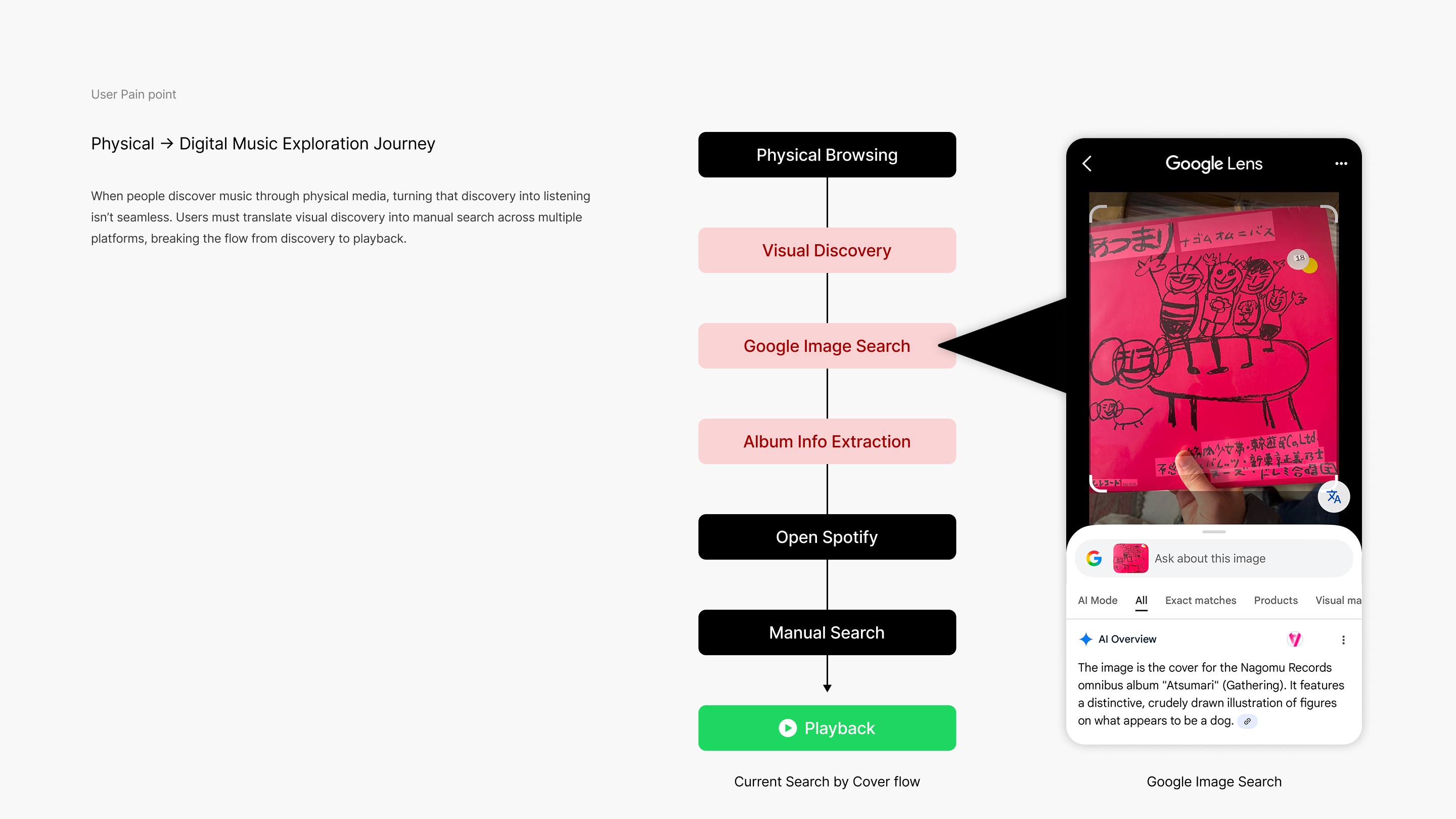 When people discover music through physical media, turning that discovery into listening isn’t seamless. Users must translate visual discovery into manual search across multiple platforms, breaking the flow from discovery to playback.